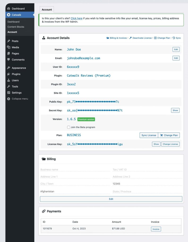 If you’re an agency or freelancer managing a client’s website, you can safely install and use our plugin without exposing billing or account information. White-label mode hides sensitive details in the client’s WP Admin.