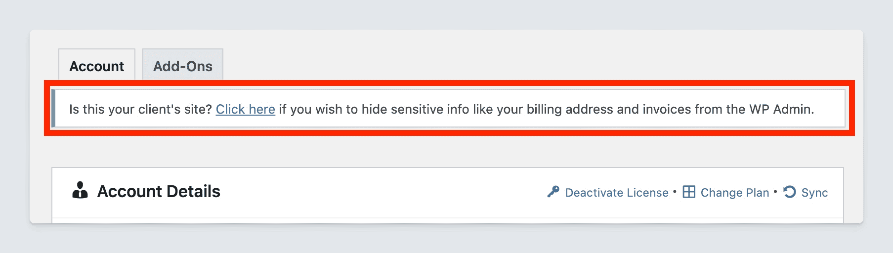 - After activating the license on a client site, go to the Account page and click the link in the admin notice to activate white-label for a seamless handoff.