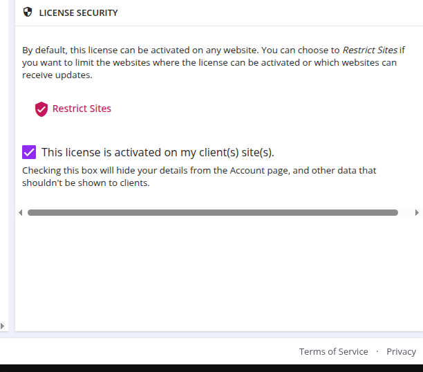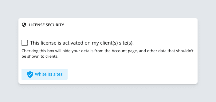 - Navigate to the Licenses tab. Select the relevant license and check “This license is activated on my client(s) site(s)” to conceal license details on that site.